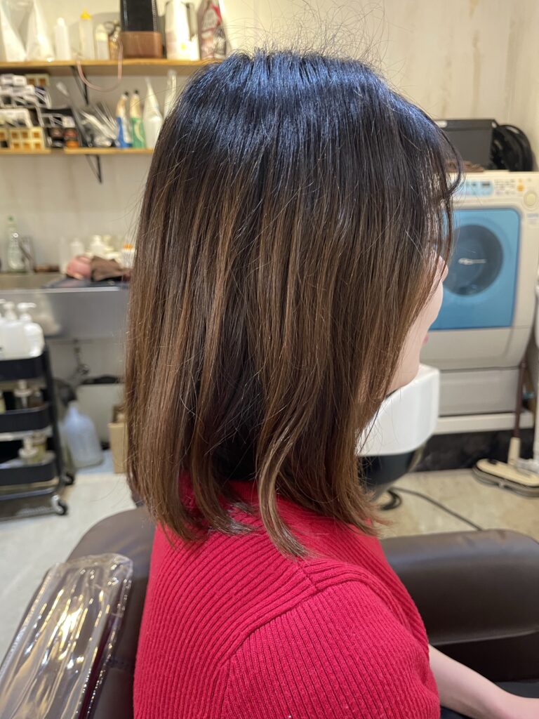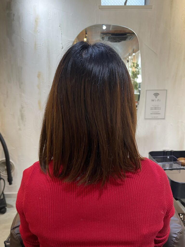 矯正かけても表面を少しだけ短くして、根本から縮毛矯正をやるのではなく、癖がそこまで強くないので、根本1〜2センチ外して中間部から毛先にかけて丁寧にアイロンを入れてあります。