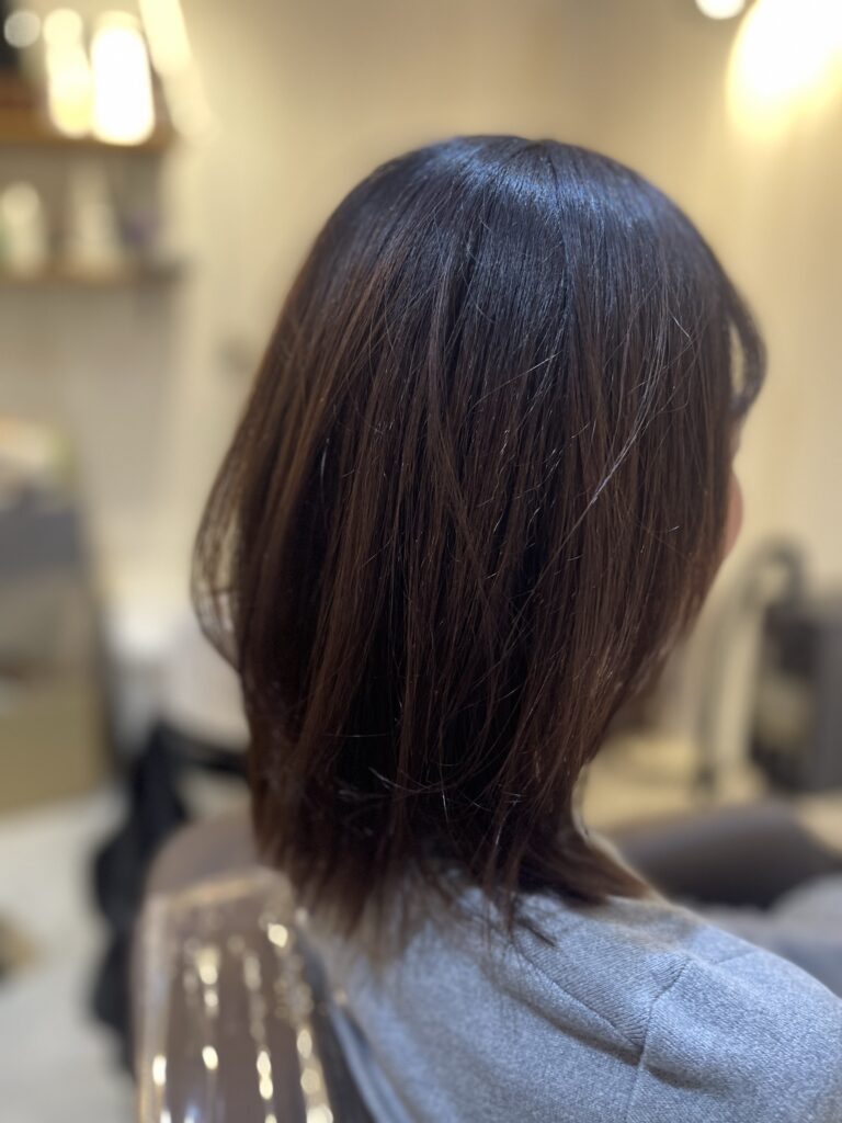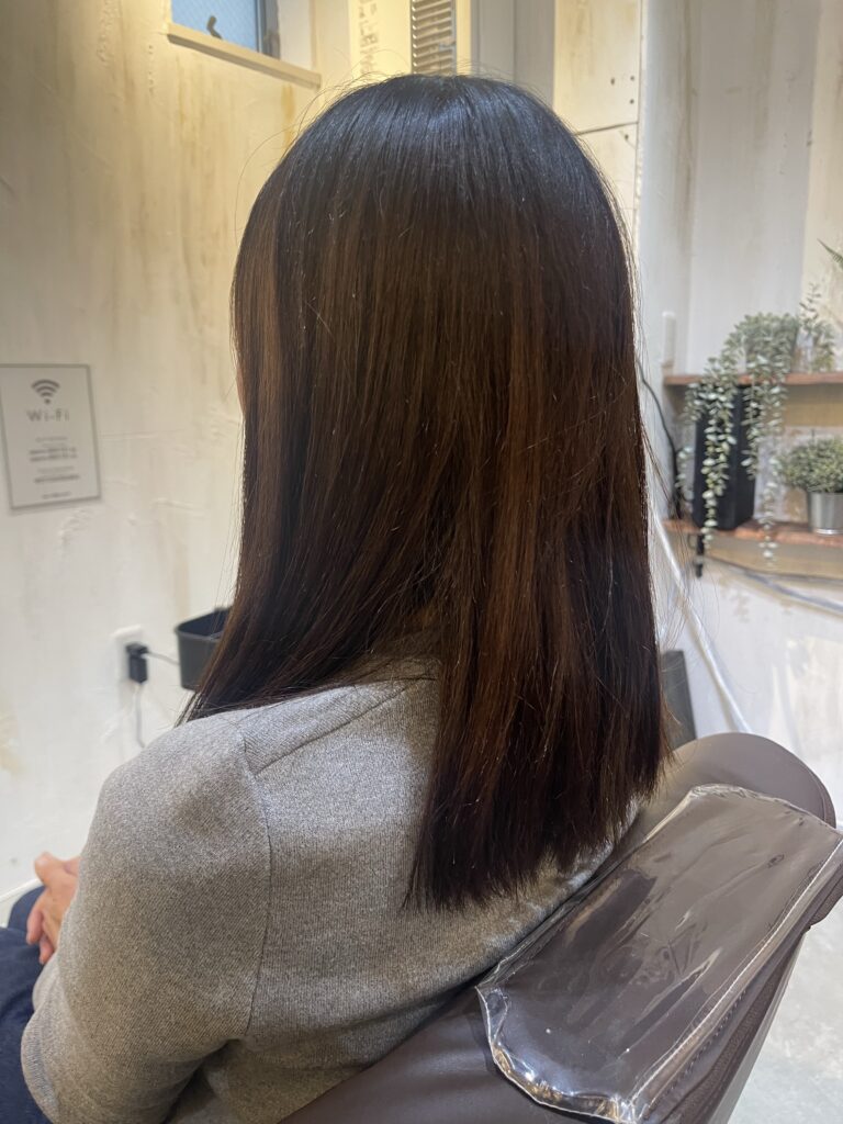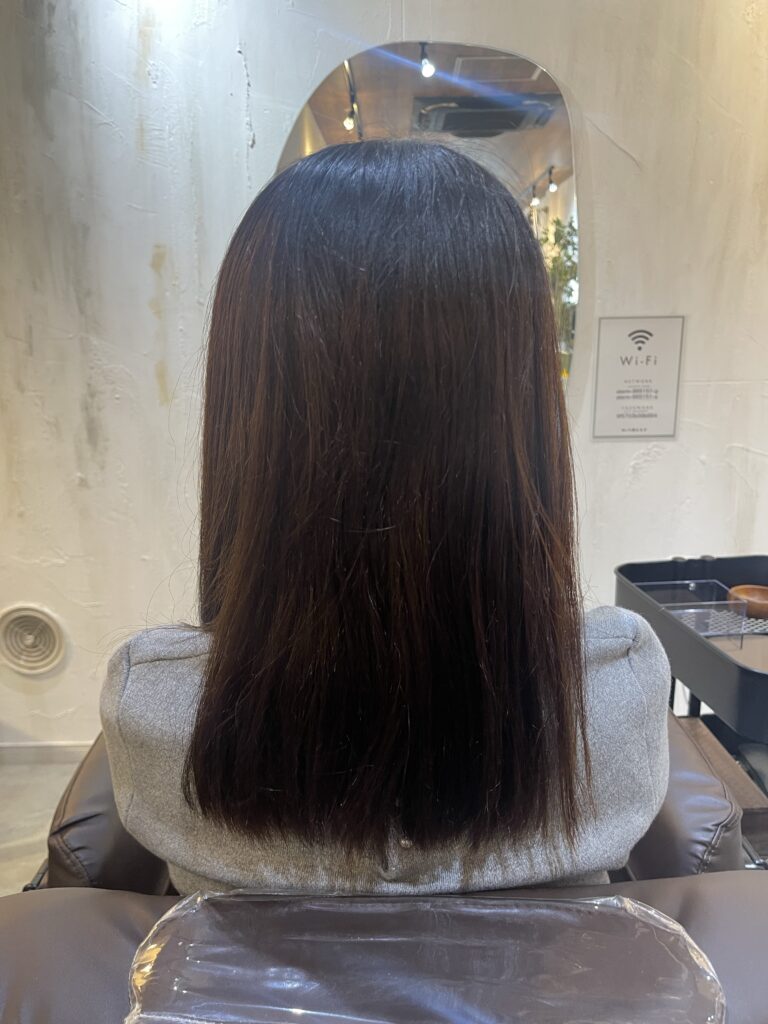 縮毛矯正って一回やると、かけたところは基本的に真っ直ぐの状態になるので、ロン毛に縮毛して短くしまうと、根元が伸びてきた時に毛先真っ直ぐで根本癖毛で、なんかシルエットが四角くなりやすくなるんですよね。