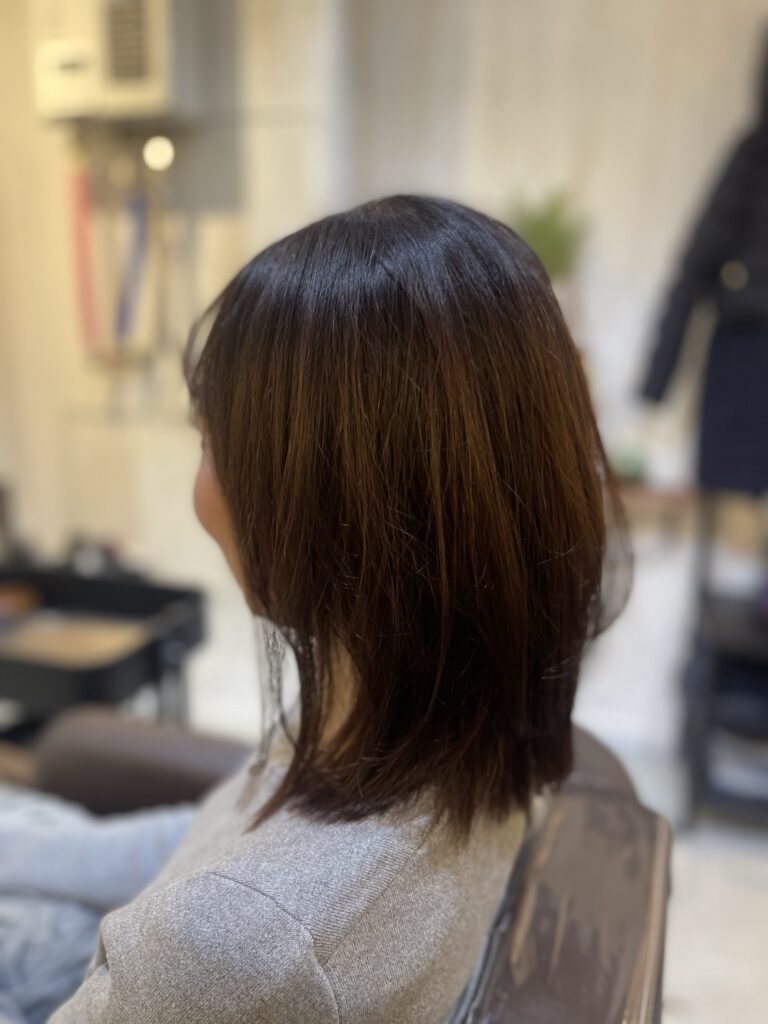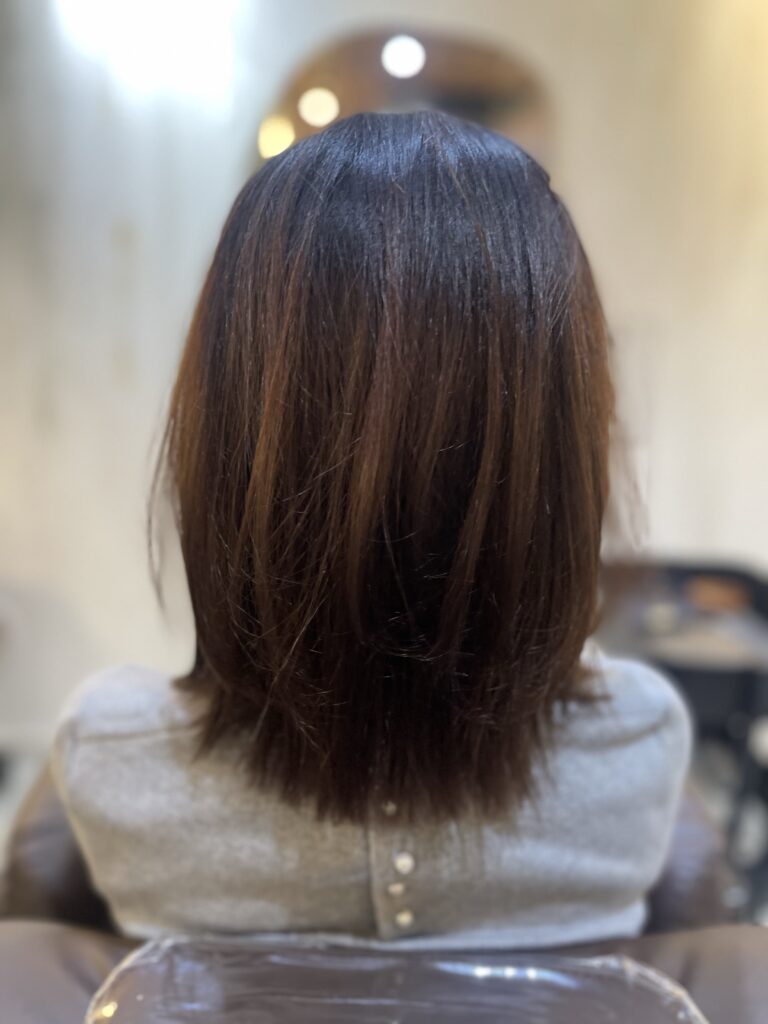縮毛の履歴が毛先にあり、もう既に根元が伸びてきてるのでシルエットが四角くなってる状態です。